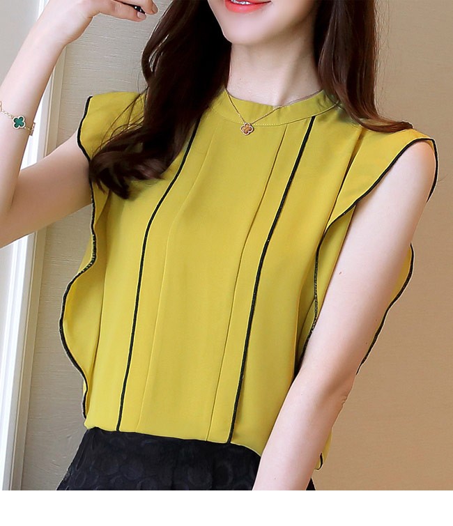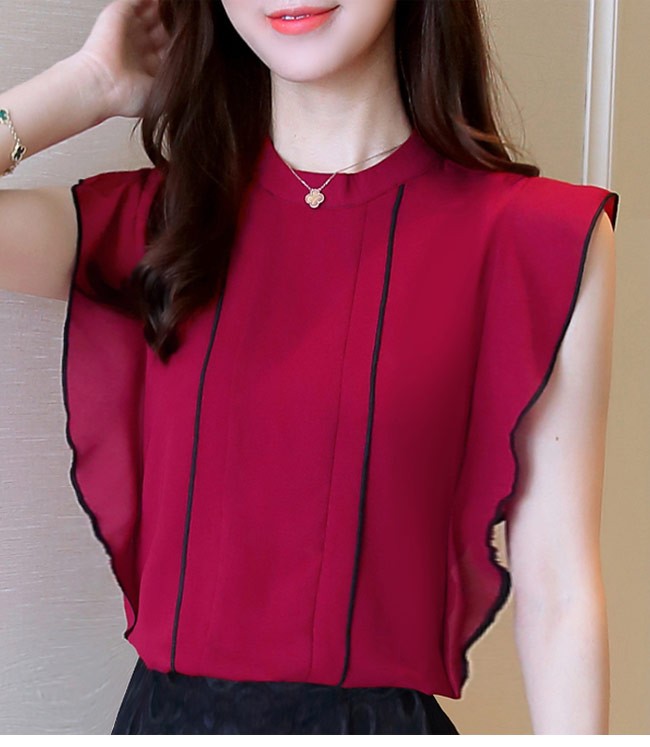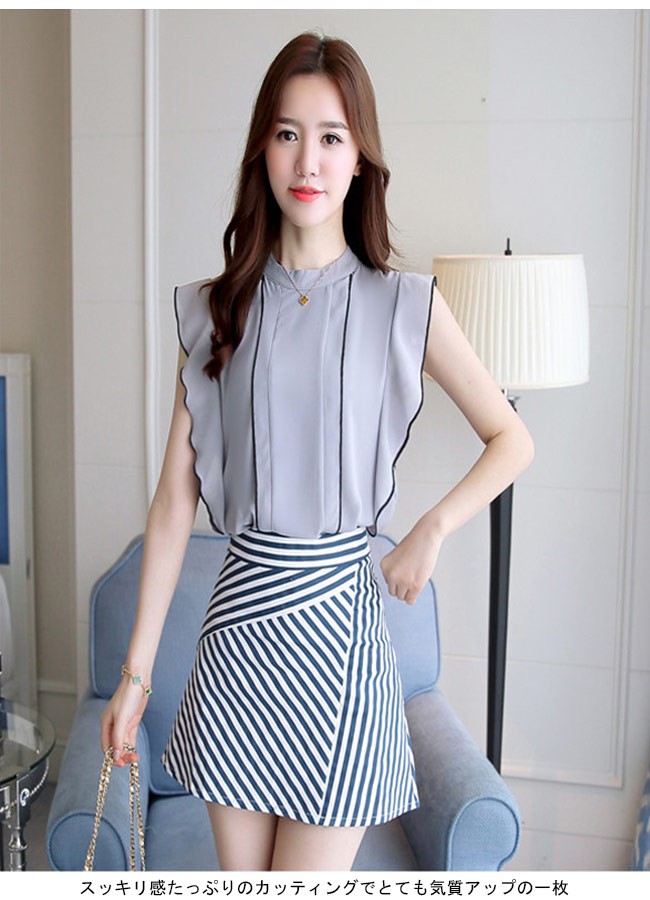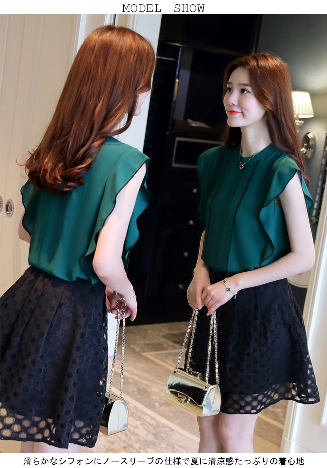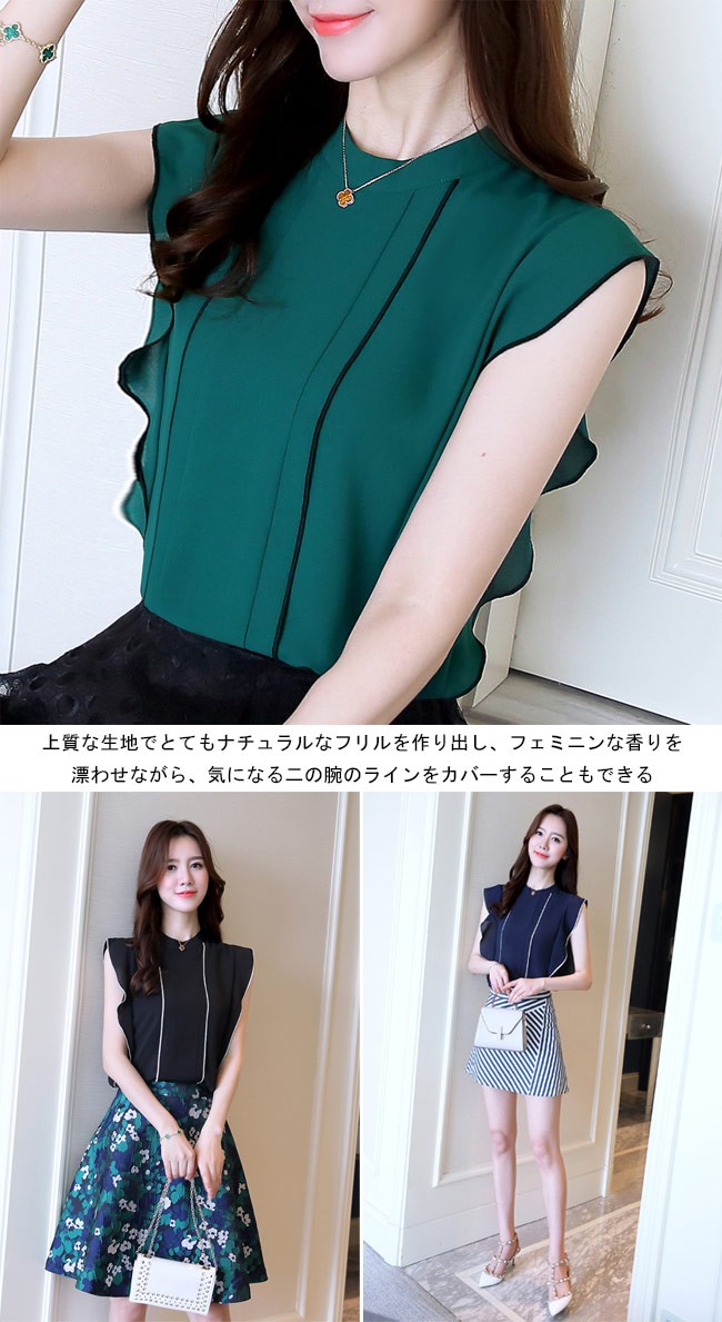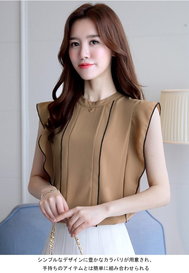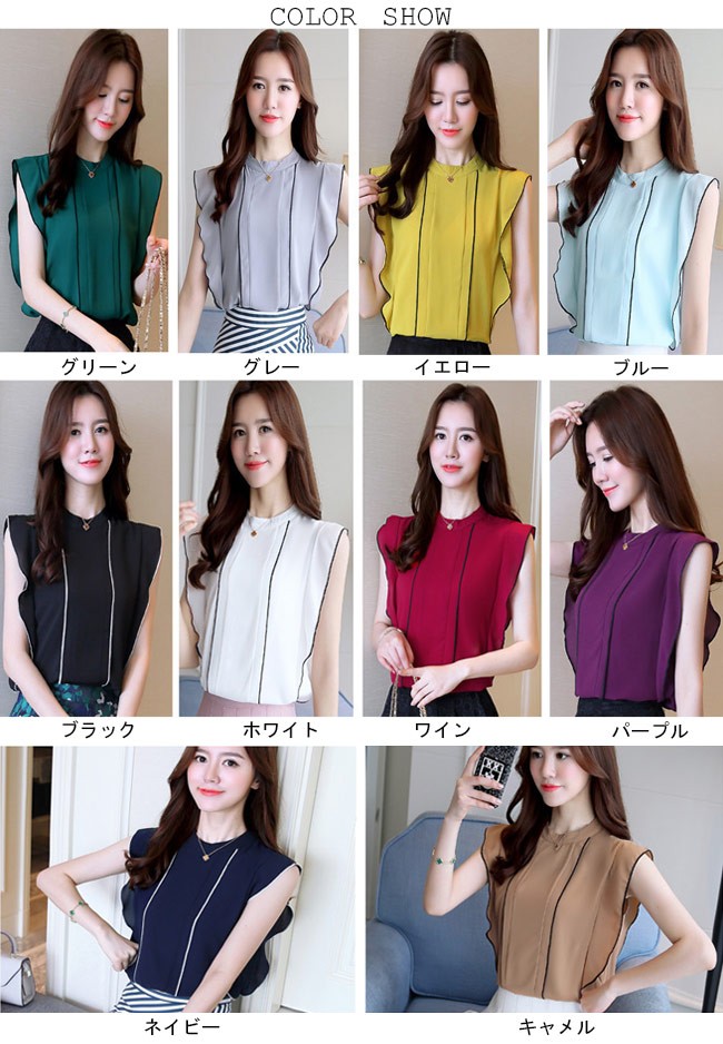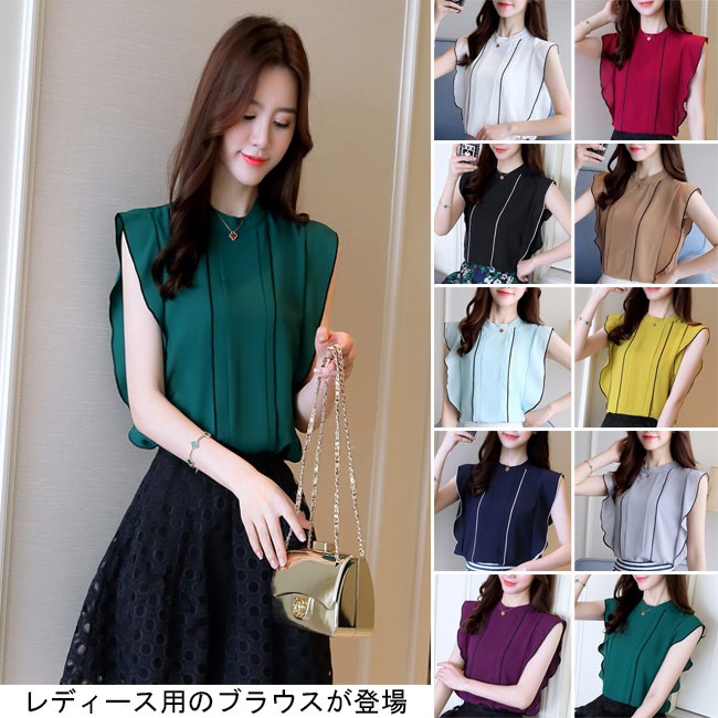 シフォンブラウス ノースリーブ レディース シフォンシャツ 女性用 夏物 トップス 薄手 Tシャツ タンクトップ 通勤 スッキリレディース用のブラウスが登場滑らかなシフォンにノースリーブの仕様で夏に清涼感たっぷりの着心地上質な生地でとてもナチュラルなフリルを作り出し、フェミニンな香りを漂わせながら、気になる二の腕のラインをカバーすることもできるスッキリ感たっぷりのカッティングでとても気質アップの一枚シンプルなデザインに豊かなカラバリが用意され、手持ちのアイテムとは簡単に組み合わせられるカラー:グリーン グレー イエロー ブルー ブラック ホワイト ワイン パープル ネイビー キャメル素材 ポリエステルサイズ(cm) S M L XL 2XLS 肩幅33 バスト85 着丈61M 肩幅34 バスト89 着丈62L 肩幅35 バスト93 着丈63XL 肩幅36 バスト97 着丈642XL 肩幅37 バスト101 着丈65ご注意:※サイズは平置きサイズです。素人採寸ですので、若干の誤差がございます、ご了承ください。