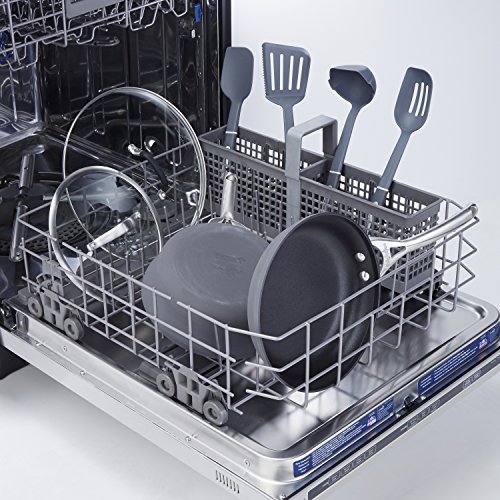 Heavy-gauge aluminum construction ensures even heating and is hard-anodized for durability. It also makes it dishwasher-safe.