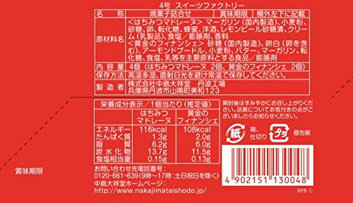 原材料:<はちみつマドレーヌ>マーガリン(国内製造)、小麦粉、砂糖、卵、転化糖、蜂蜜、洋酒、レモンピール砂糖漬、クリーム(乳製品)、食塩/膨脹剤、香料<黄金のフィナンシェ>砂糖(国内製造)、卵白(卵を含む)、アーモンドプードル、小麦粉、バター、マーガリン、転化糖、食塩、乳等を主要原料とする食品/膨脹剤