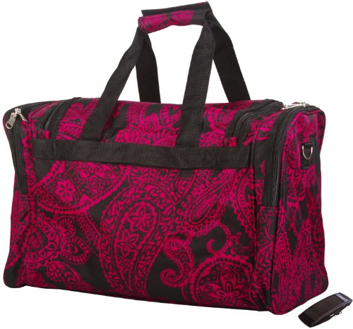-. Brand : World Traveler -. ClothingSize : 19-inch -. Color : Damask - Magenta Pink -. Department : womens -. EAN : 0763598185466 -. Feature : Adjustable, detachable non-slip padded shoulder strap / U-top opening provides easy access to roomy zipper secured main compartment / Metal feet allows stabiity to bag when setting down and provides bag floor not to touch floor directly to get dirty / Front exterior zip pocket with two exterior end zip pockets / Silver pewter hardware -. Model : T19-641 -. MPN : T19-641 -. NumberOfItems : 1 -. PackageQuantity : 1 -. PartNumber : T19-641 -. ProductGroup : Apparel -. ProductTypeName : LAGE -. Size : 19-inch -. Title : World Traveler Magenta Pink Duffle Bag 19-inch -. UPC : 763598185466