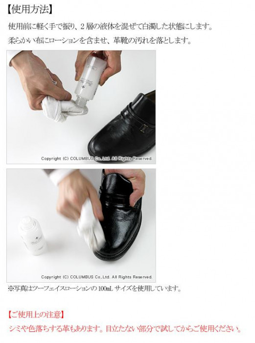 | 溶剤の働きで汚れを落とすタイプの液体靴用クリーナーです。汚れを溶解して取り込み除去します。ローションの感触はサッパリとしているので、皮革本来の自然な質感をお楽しみ頂くことができます。 |