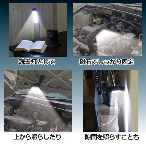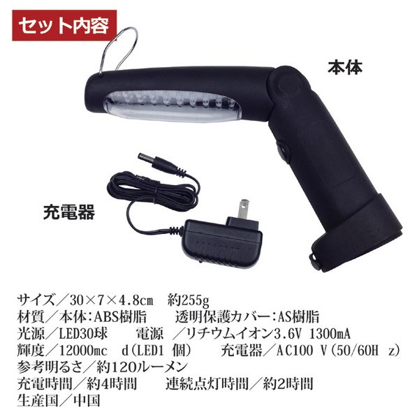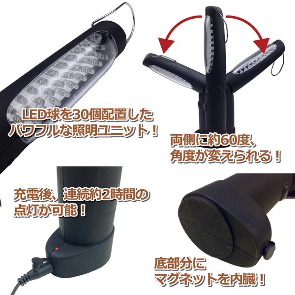 こんなライトが欲しかった!LEDが30球も配置された強力照明です。リチウムイオン電池を内蔵し、充電して使用ができます。約2時間の連続点灯が可能。本体は両側に約60度角度を変えることができます。底部分はマグネットが内臓されてますので、自動車のボンネット等の鉄部分に固定することができます。吊り下げフックも付いてます。