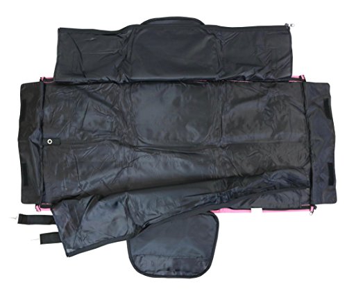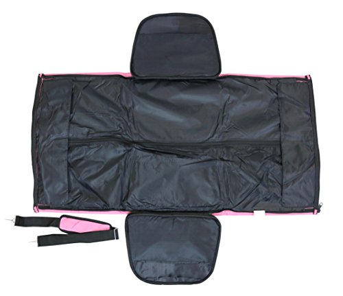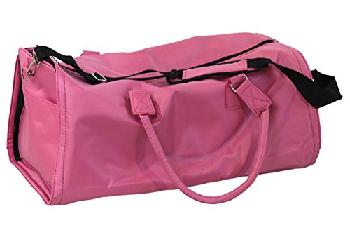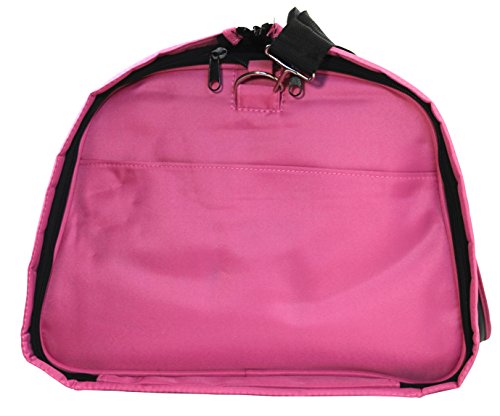 Product Description This all in one duffel and garment bag can hold up to 40 pounds and is compliant for overhead storage on most airlines. Unzips to lay flat, revealing the garment bag inside that holds up to 15 wire hangers. 2 inside and 2 outside pockets for more organization: and storing the removable, adjustable shoulder strap when not in use. Pink exterior, black interior. Dimensions: duffel bag - 21.5 x 14 x 9 inches, garment bag - 38 x 20 inches. 0