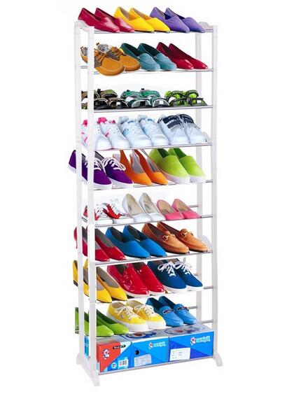 The free standing plastic/metal shoe rack holds 30 pair of shoes. The larger the shoe the less total pairs can be displayed. The 10 shelves are slanted for easier display and visibility of your shoes. To ensure stability of the unit, you may want to use a rubber mallet to help secure the aluminum poles properly into the plastic frame to ensure that all parts are secure, as the bars fit very snugly and may not be able to be fully inserted by hand, without the use of a rubber mallet or other tool that will not damage the rack.