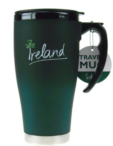 Large Ireland travel mug holds approx. 16 oz. of hot or cold liquid. Will keep hot liquids hot for 1-2 hours. NOT microwave or dishwasher safe, wash by hand. Contains stainless steel. Mug is black even though the image appears green. Approx. 7 inches H.Feature