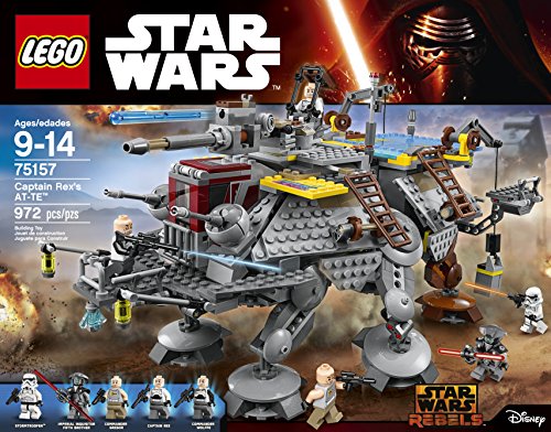 -. Binding : Toy -. Brand : -. EAN : 0673419248624 -. Feature : Features a rotating top-mounted gun with spring-loaded shooter and extra ammo, 2 cranes, 4 ladders, movable legs, opening cockpit with space for a minifigure, opening rear top section, opening rear access door with 3 clones, and a built-in lifting handle / Weapons include 2 blasters, 2 blaster r.i.f.l.es and Fifth Brother's Light saber / Includes 5 minifigures: Captain Rex, Commander Gregor, Commander Wolffe, Imperial Inquisitor Fifth Brother and a Storm trooper / Captain Rex's AT-TE measures over 7" (20cm) high, 12" (33cm) long and 9" (25cm) wide / Lower the rear door to access the inside, rotate the gun and fire the spring-loaded shooter to send Fifth Brother and Storm trooper running -. IsAdultProduct : 0 -. Label : -. Manufacturer : -. Model : 6136720 -. MPN : 6136720 -. PackageQuantity : 1 -. PartNumber : 6136720 -. ProductGroup : Toy -. ProductTypeName : TOYS_AND_GAMES -. Publisher : -. ReleaseDate : 2016-06-01 -. Studio : -. Title : Captain Rex's AT-TE 75157 -. UPC : 673419248624 -. Warranty : No Warranty