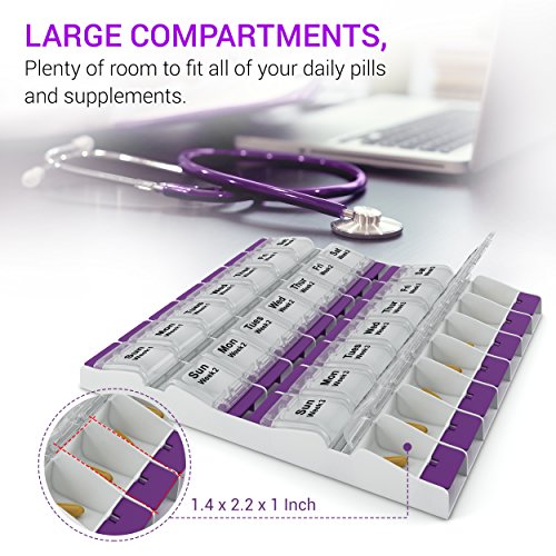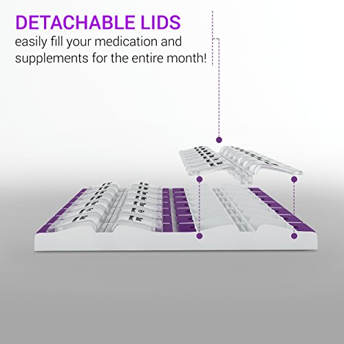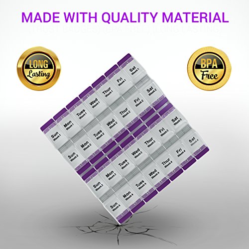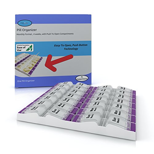 PillzRX Monthly Pill Organizer We designed this pill box for the people who wish to fill their medication only once a month. Features: · Monthly pill case format,4 weeks, 31 days, 28 days, Daily pill compartments · Large compartments allowing you fit all your pills, supplements and vitamins all into one compartment. · Detachable lids making it easy to fill and clean your monthly pill box. · Slim and low profile makes it a perfect house item, while still providing its purpose. · Made with the best quality material, being BPA and FDA certified, we guarantee your satisfaction. · If you're not happy with your order, we refund you 100%, no questions asked. 0 |
