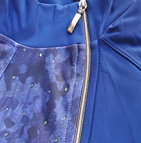 Close-fitting jacket in thermal fabric camouflage/jeans print and oblique zip with blue strass to enrich the garment on one arm.