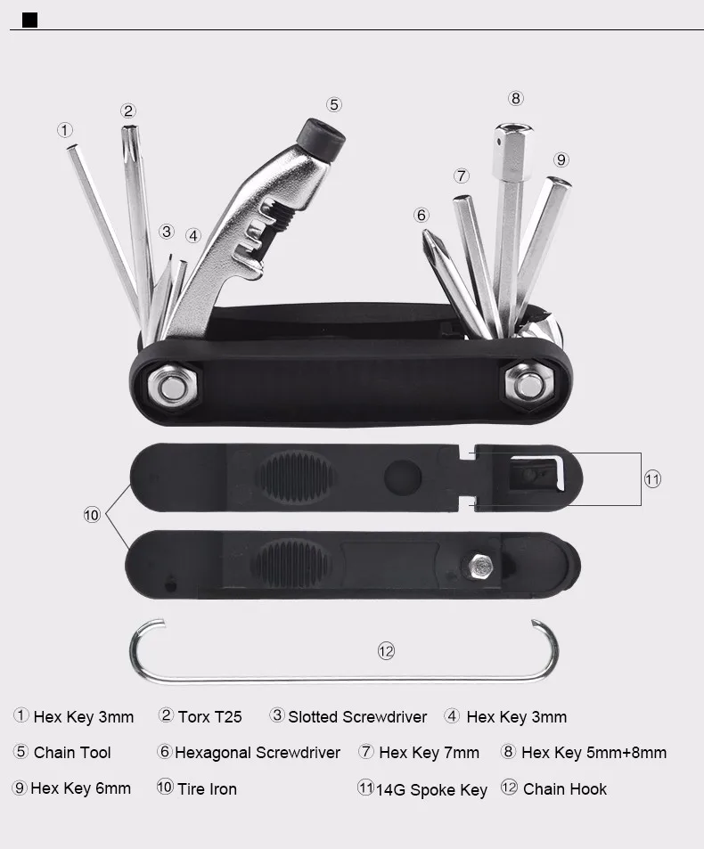 8.Hex 5mm + Hex 8mm 9.Hex 6mm 10. tire spoon 11.Chain hook,12. Spoke key