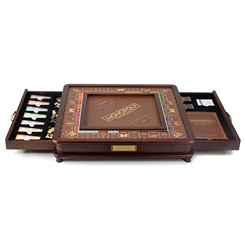 - Feature : Perfect for display! All pieces can be put away into elegant wooden game board / Faux-leather rolling area and book of title deed cards / Gold foil-stamped game path and rolling area / Weighty, plated die-cast tokens, houses and hotels / Free pack of dice included