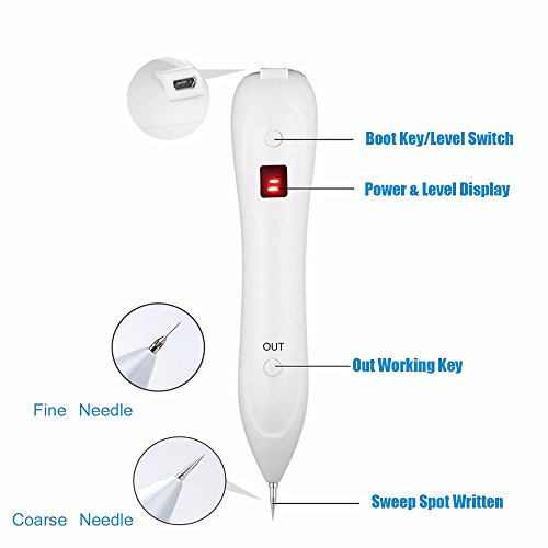 -. Feature : UPGRADE with display and 6 adjustable power outputs, suitable for different skin tolerance if you have moles ,freckles, tattoo, verruca vulgaris, granulation tissue and other pigmentation on skin epidermis, immediately make your skin smooth and clean / No Bleeding and feeling of electricity with the latest technology of microcomputer control, more steady and safer as home use facial beauty tool, battery level can be observed visually on LED Display if you quickly press the OUT button twice, keeping working over 5 hours on a charge / Usage: Cleaning the needle with alcohol, gently sweeps from back to front within a small area, it'll be better if you do a testing on apples or arms before first use. Do not stop in one place to avoid burning your dermis layer. Clean your eye spots in twice or more times carefully / Operations: Long-press ON/OFF button for 3s to start, press once to first mode and once to second mode. If you press to the sixth mode, press again and it'll be back to the first, the working mode can be showed on display. This device will keep working when you keep pressing OUT button, but it has power-off protection if you keep pressing it over 2 min once / Package includes: 1 spot eraser pen, 5 fine needles, 1 big needle, 1 USB cable and product manual ,including a safer and portable Yartar beauty solution