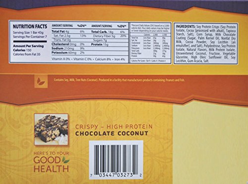 -. Feature : High Protein - 15 grams Per Bar / Lower Fat - 4 grams Per Bar / 150 Calories Per Bar / Gluten Free / No Cholesterol