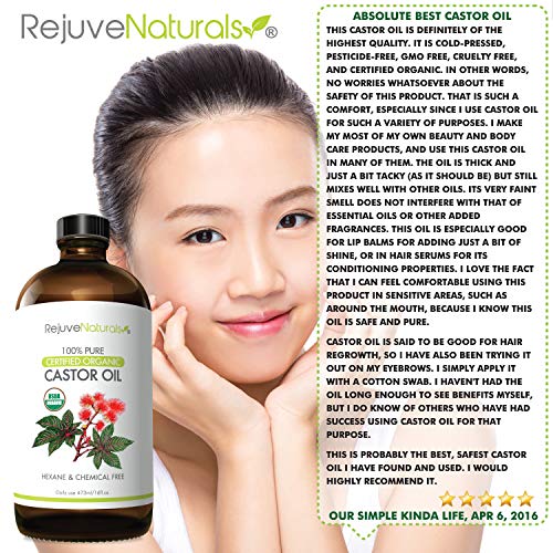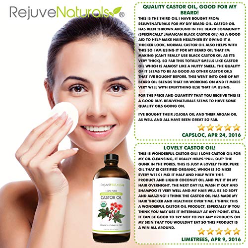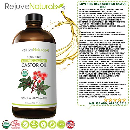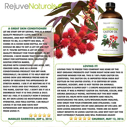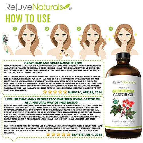 より健康で太い髪の成長 - 保湿、輝く肌 あなたの浴室用キャビネットは高価な美容製品のキャッシュで詰まっていますか? RejuveNaturals Organicひまし油であなたのルーチンを単純化してください。あなたはこの単純で自然な驚異が提供することができる印象的な利益に驚くでしょう。 ヒマシ油はアフリカとインドの熱帯地域に自生しており、その油が豊富なヒマシ豆で有名です。ひまし油には、ビタミンE、たんぱく質、オメガ6と9が含まれています。これらは、髪と肌に良い成分です。それは髪の毛の落下の減少、早すぎる髪の白髪化を助け、髪の成長を加速させると共に頭皮関連の問題と戦う。あなたの肌のために、それは色素沈着、にきびや老化であるかどうか、ヒマシ油はそれのすべての解決策です。 すべてのボトルには、ヘキサンと化学薬品を含まないプレミアムオーガニックコールドプレスヒマシ油だけが含まれているので、最高品質のものであることがわかります。私たちの油は、肌や髪に容易に吸収する脂肪酸が豊富です。それは強力な栄養と保湿剤です。