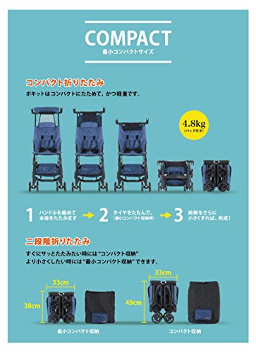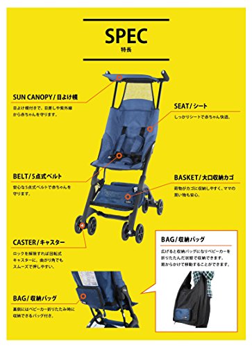日本国内折りたたみ最少ベビーカー ※自社調査による/5点式ベルト(安心な5点式ベルトで赤ちゃんを守ります。)/キャスターロックレバー(坂道や凸凹の道などで前輪のキャスターをロックできます。)/幌(赤ちゃんを日差しから守ります。)