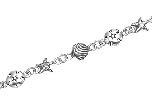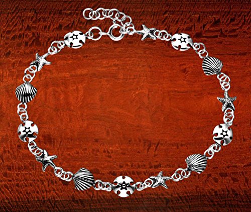 -. Title : Sterling Silver Scallop Shell, Starfish & Sand Dollar Anklet, 9"