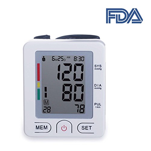 -. Feature : SILENAT AND QUICK INFLATION: Based on Oscillometric technology, auto cuff inflation and deflation is ultra-silent and user-friendly; / GUARANTEED ACCURACY: Clinically tested and proven to be reliable and accurate when used in accordance to manual. Last three readings average, FDA approved device. Auto shutoff in 2 minutes to save energy, Eco-friendly; / IRREGULAR HEART BEAT DETECITON: Irregular heartbeat detector detects and alerts you of irregular heartbeats while your blood pressure is being measured; / PORTABLE SIZE AND INNOVATIVE DESIGN: Easy to operate for adults, young people wrist circumferences from 5.3 to 8.4 inches. It's portable with case; you can use it at anytime and anywhere. Powered by 2 AAA size alkaline batteries (not included). Easy one-press operation allows home blood pressure monitoring to be both simple and accurate. / ONE-KEY MEASURING: It measures your blood pressure and pulse rate simply and quickly. Nice item to monitor blood pressure changes.