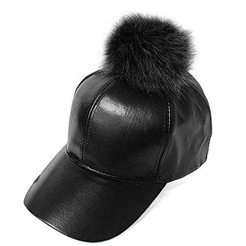 (Crescendo SJ INC)/Accessories/Hats/DIRECT FROM USA/NEW FAUX LEATHER FUR POM POM BALL ADJUSTABLE SIZE BASEBALL CAP PM3041BKBK