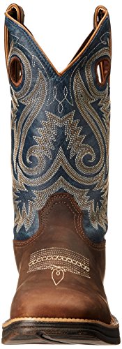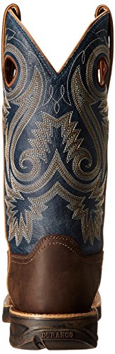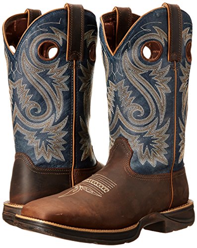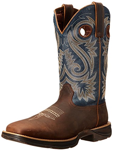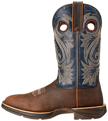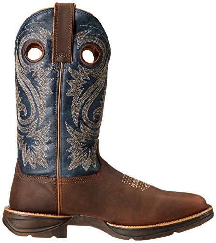 Studio : Durango Publisher : Durango Binding : Shoes Product Description Choose a men's cowboy boot designed for comfort. The Rebel by Durango; Saddle Western Boot is a comfortable brown and blue boot that you'll like wearing. You get a 60-day comfort guarantee! This cowboy boot has a contoured and ventilated cushion footbed that's removable. The tempered steel shank supports your arch. The comfort doesn't end with interior features; the entire boot is designed to be lightweight. You can't be comfortable in heavy boots. The rubber outsole on the footwear is flexible for easy movement. It has a vintage finish for a cool, rebel look. The boot has a square toe and a 1 ½-inch rocker heel. This men's cowboy boot is distressed full-grain leather. It has a brown foot and a dark blue shaft with light embroidery. The top of the 12-inch boot has both pull straps and pull holes that make it easy to put on every day. For rugged western style, get this comfortable cowboy boot! ; If you don't find these boots to be ultra-lightweight, flexible and comfortable, you may return them to your dealer within sixty (60) days of purchase for full refund. Proof of purchase required; participating dealers only. 0