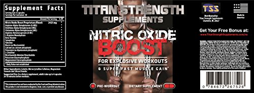 -. Feature : *** 5 Day Flash Sale Now On *** HUGE INCREASE IN MUSCLE AND STRENGTH OR YOUR MONEY BACK!! Within A Week When Taken With A Rigorous Workout Plan. You Will Feel The Titan Strength Nitric Oxide Boost Kicking In And Increasing Muscle And Strength GUARANTEED Or Your Money Back! Your Workouts Will Never Be The Same Again! / #1 CUTTING EDGE PRE WORKOUT SUPPLEMENT. Our Formula Contains Four Unique Blends Developed to Increase the Production of Nitric Oxide in the Body. / GREAT FOR YOUR HEART! Nitric Oxide is a Naturally Occurring Compound That Facilitates Increased Blood Flow, Oxygen, and Nutrient Delivery Within the Body Making Explosive Workouts and Getting Blood and Nutrients to Muscles Including the Heart Much More Efficiently / INCREASED BLOODFLOW MEANS HELP TO MALE PERFORMANCE! Your Lady is Bound To Notice A Difference As Nitric Oxide Increases Blood Flow To All Muscles In Your Body / NO RISK 30-DAY MONEY BACK GUARANTEE! YOU HAVE NOTHING TO LOSE! We Are So Confident You'll Love Our Product You Can Even Return The Empty Bottles For Full Refund If You're Not Satisfied! Alyse Masserano Used our Nitric Oxide Boost to Help WIN the Dexter Jackson Classic in Memphis TN OVERALL and her Category of Best Physique AND THEN the Music City Muscle in Nashville TN, Recommended by her AND her Trainer to ALL BODY BUILDERS. We Love Supporting Winners With Our Products