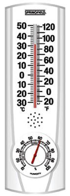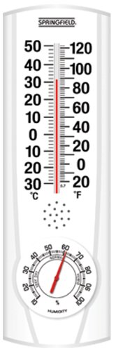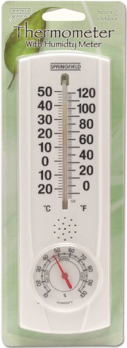 Studio : Taylor Thermometers Publisher : Taylor Thermometers Binding : Lawn Patio Product Description Watch the temperature and humidity rise and fall with the Springfield Vertical Thermometer and Hygrometer. This 9.125-inch analog patio thermometer and Hygrometer adds classic style and trustworthy temperature and humidity readings to your outdoor space. The low-profile body houses bold, easy-to-read graphics that indicate temperatures along the Fahrenheit and Celsius Scales as well as humidity percentage. Quality, UV-fade-resistant graphics withstand the the harshness of the outdoor elements. Shatter- and weather-resistant, this thermometer is built to last. Bold and easy-to-read numbers surround the classic mercury-looking red liquid. A bright white background makes the sans serif black lettering even more legible from across the porch or yard. 0
