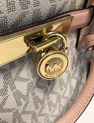 -. Feature : MICHAEL Hamilton Traveler LG TZ Tote Signature Vanilla MK/Ballet Pink / Top Zip, Signature MK leather, Top handle and shoulder strap, Saffiano Ballet Pink Leather accents / Interior : 1 main compartment, 4 slip pockets, 1 zip secure pocket. / Exterior hidden slip pockets both in front, Signature lining. Exterior:back hidden slip pocket , mk locker and key. / Measures Approximately: 6"L double handles; 13"X9.5"X5" with adjustable and detachable chain-detail strap