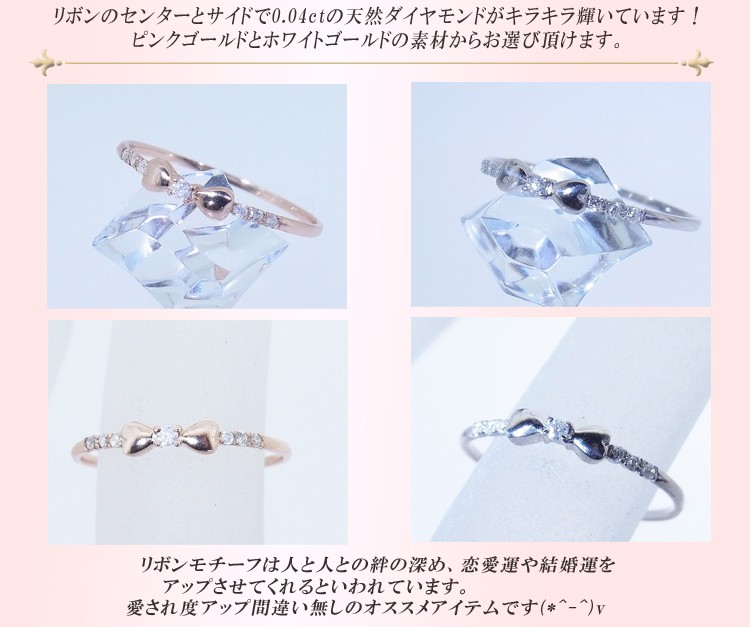 商品説明 リボンのセンターとサイドで0.04ctの天然ダイヤモンドがキラキラ輝いています。ピンクゴールドとホワイトゴールドの素材からお選び頂けます。