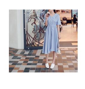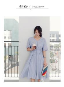 フレアワンピース ストライプワンピース 爽やか Vネック 半袖 ハイウエスト 膝丈 大人カジュアル 大人可愛い プチプラ