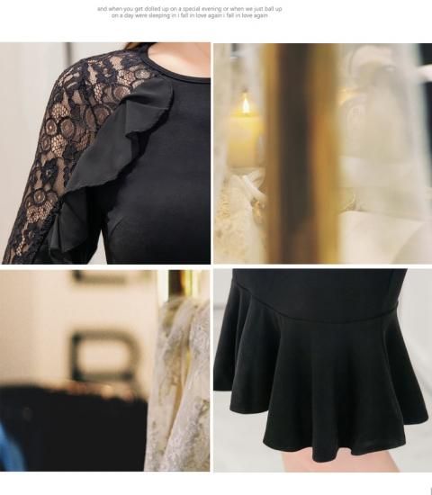 パーティードレス ひざ丈 ワンピース ブラック レース フリル 七分袖 マーメイド 大人 上品 エレガント お呼ばれ drgz2250