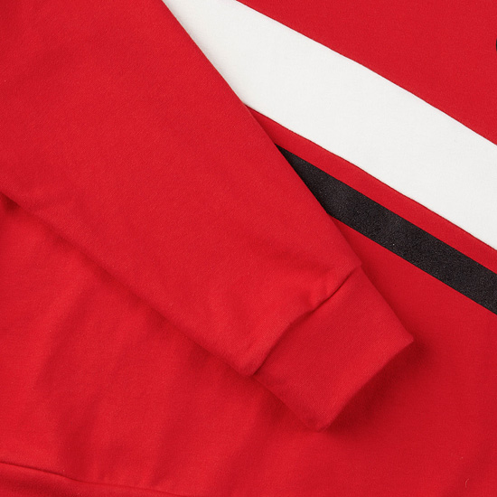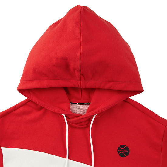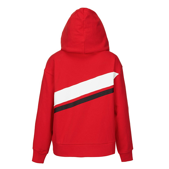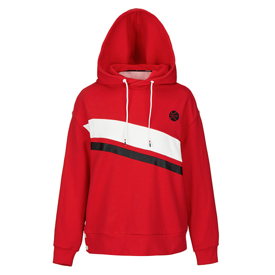 - 몸판 라인 컬러 배색으로 스포티한 무드의 여성 후드 티셔츠.