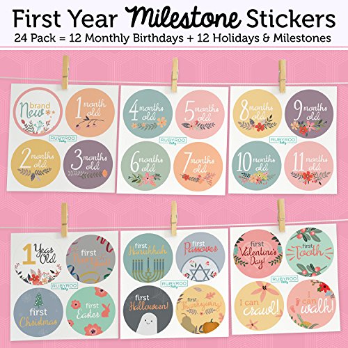 -. Feature : Just Launched! CAPTURE IMPORTANT MILESTONES: New parents are guided through 24 first year milestones and holidays with this huge sticker pack of perfectly sized 4-inch adorable designs. / MAKE LOVING MEMORIES: Peel, stick, and click! You'll fondly remember the amazing adventures & milestones with this perfect photo prop. / PAIR WITH RUBYROO BABY JOURNAL: Buy a matching baby journal for perfectly coordinated designs to store baby memories. Search Amazon for "RubyRoo Baby" and combo savings! / PERFECT BABY SHOWER GIFT: Thrill parents with this unique & thoughtful gift! Features beautiful illustrations on high-quality stickers. Free gift coupon included! / PRESERVE MOMENTS FOREVER: Thick, eco-friendly, no-glare stickers help preserve memories & stories for generations. The perfect addition to any photo album, diary, & scrapbook!