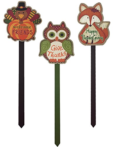 - Happy Harvest Fall Decoration Outdoor Wood Yard Stake Sign (22in) - Happy Thanksgiving Fox, Give Thanks Owl, Welcome Friends Turkey - Set of 3