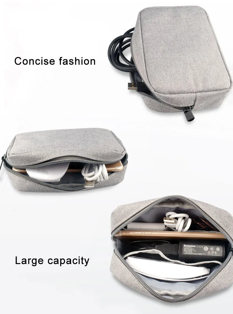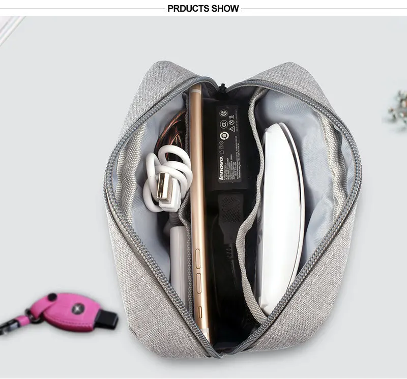Storage for:Cosmetic, cell phone, cables, charger, sundries