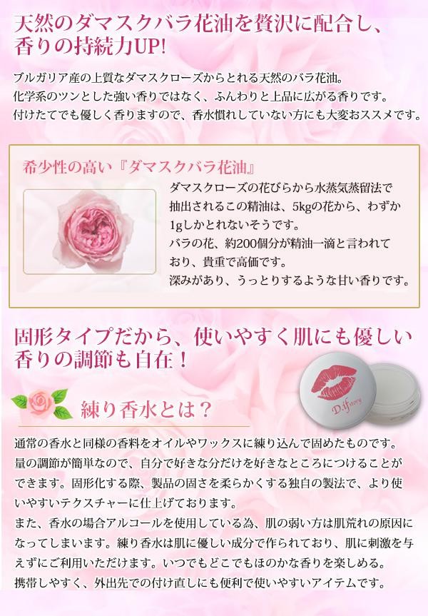 | 叶恭子さんがこよなく愛するダマスクローズの香りを基調とした、優雅で気品高い香りの練り香水です。ブルガリア産、天然ダマスクバラ花油を贅沢に配合し、爽やかなレモンやグリーンノート、優しいムスクやウッディの香りを調和させました。「ソリッド(固形)」タイプなので、広がらずにポイントに塗布できます。付けたてでも優しく香り、香水慣れしていない方にもオススメです♪ |