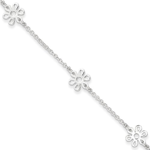 Looking for a fun way to show off your long sexy legs, try a shiny flower anklet that will cause smiles to bloom. Featuring 8mm flower charms stationed between a 1.5mm cable chain that is 9 inches in length and finished with a 1-inch extender plus a fancy lobster clasp.Feature