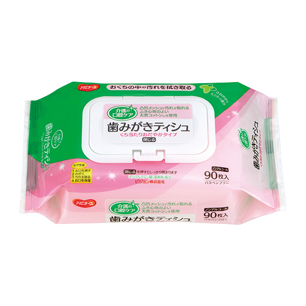●「ハビナース 歯みがきティシュ くち当たりおだやかタイプ さわやかなミントの香り 90枚入」は、おくちの中(歯や歯茎、舌など)の汚れを拭き取る歯みがきティシュです。