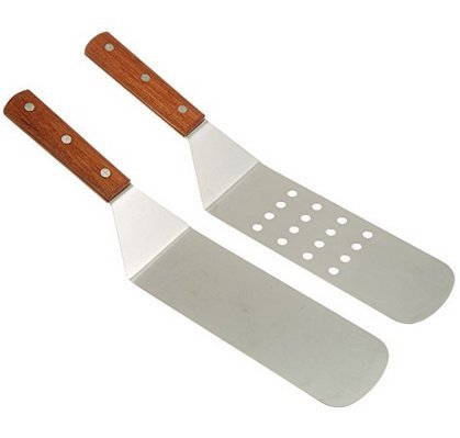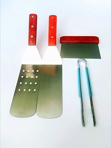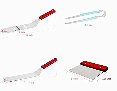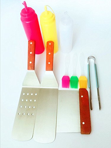 2 oversized professional grade restaurant style stainless steel spatulas. Great for flipping burgers, pancakes, veggies and all other grill or griddle applications. 1 stainless steel chopper/scraper to dice food and scrape griddles clean. 3 premium leak-free fine tip bottles for condiments and liquids like oil or water.