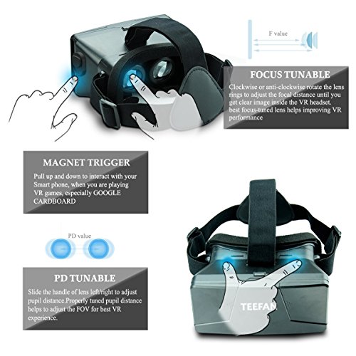 -. Binding : Electronics -. Brand : TEEFAN -. Color : Phone Fixed Inside, Magnet -. EAN : 0703341418847 -. Feature : Professional and made of high quality plastic. / With magnet function. Big size of lens to get wider FOV and immersive experience. / Adjustable focal and pupil distance helps to get the best images. / The full amount headband wears comfortable and decrease the press on bridge of nose while watching moving or playing games. This new version includes nose paddings. / Fits for screen size within 5.7 inch. -. Label : TEEFAN -. Manufacturer : TEEFAN -. Model : B015Y97AO0 -. MPN : B015Y97AO0 -. PackageQuantity : 1 -. PartNumber : B015Y97AO0 -. ProductGroup : Speakers -. ProductTypeName : CE_ACCESSORY -. Publisher : TEEFAN -. Studio : TEEFAN -. Title : TEEFAN Plastic Adjustable Pupil and Focal Distance Magnet and QR Code Google Cardboard 3D VR Headset Virtual Reality Headset VR Glasses for iPhone Samsung HTC Nexus LG (Black) -. UPC : 703341418847