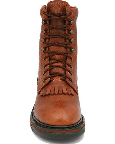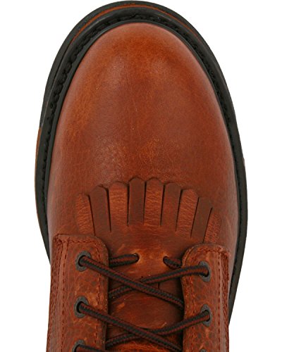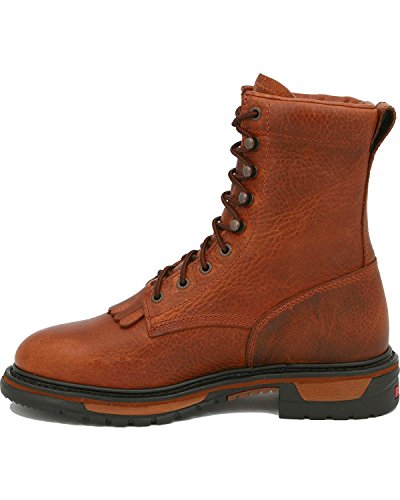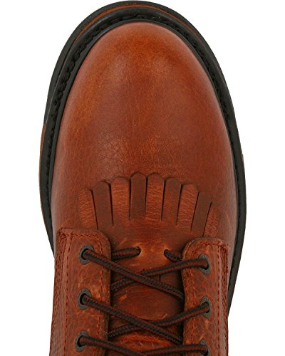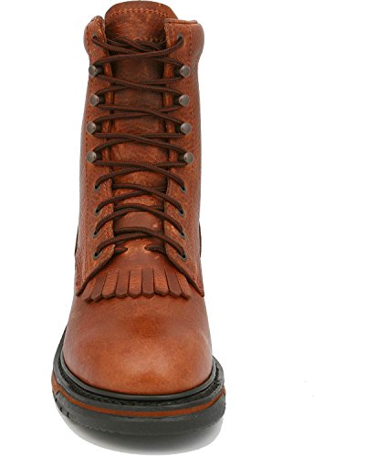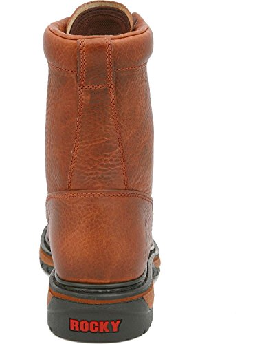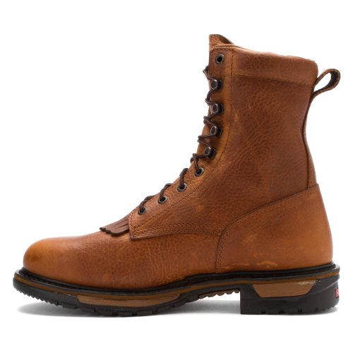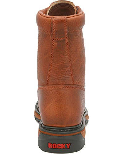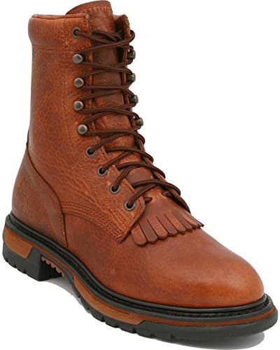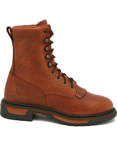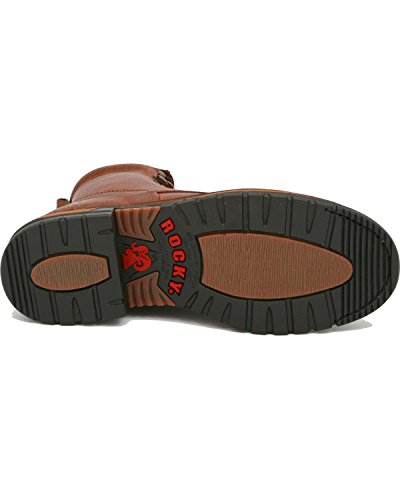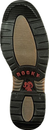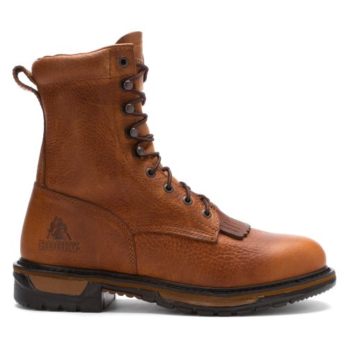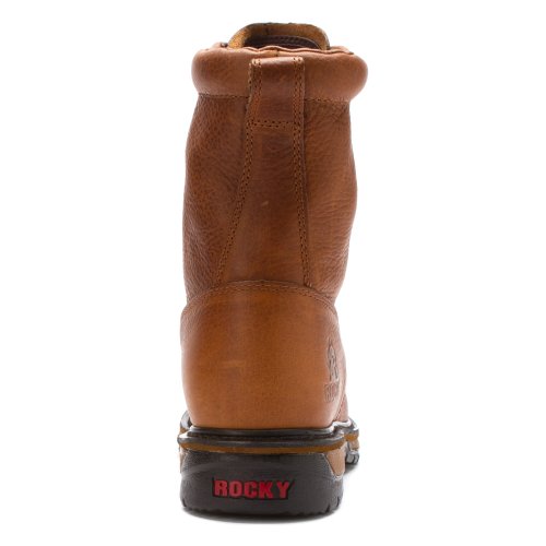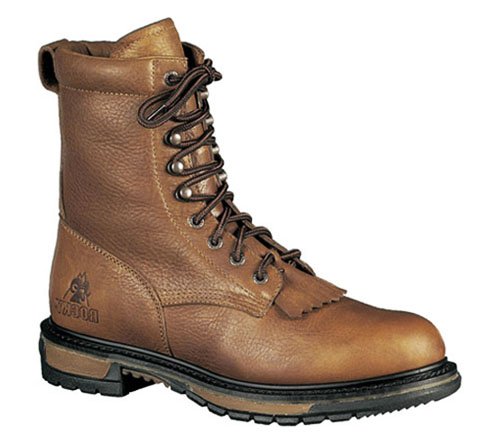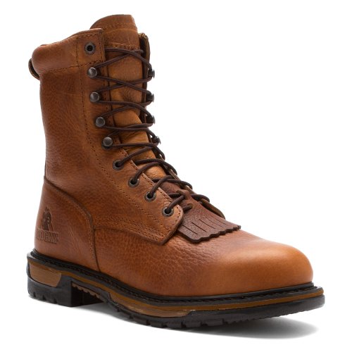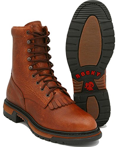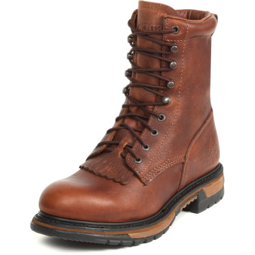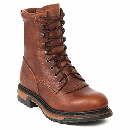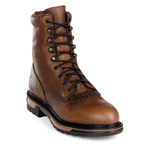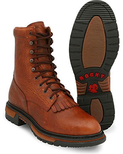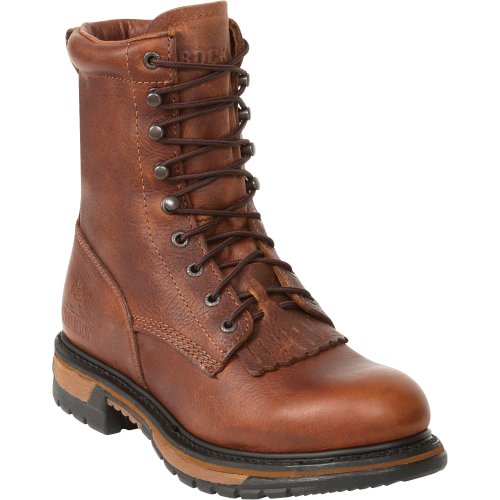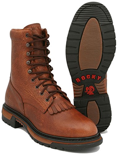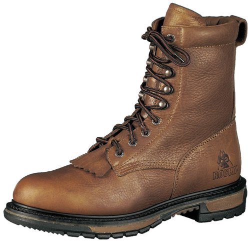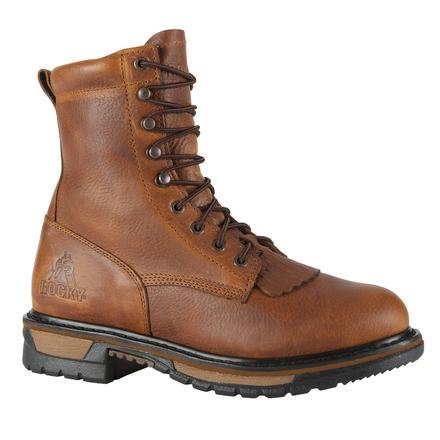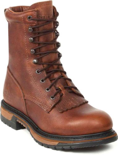 Product Description Rough riders! Rocky Rider 8" Lacers are 8-layers of comfort wrapped in a barbed wire tortilla. No, you won't find these on the kiddie menu... these are big boys' Boots. Ready for everything, tougher than anything... yet comfortable as a gym shoe. They feature the 8-part Rocky Ride Comfort System for unsurpassed comfort that's still ready for more after you hang your hat up from a 12-hour day. Durable Goodyear Welt construction makes 'em resolable, and Electrical Hazard (EH) protection helps prevent unwanted shock therapy. Here's the story on the 8-part Comfort System: Parts 1 and 2: Orthotic Foot-form and Rear Foot Cradle. The forefoot rests on a soft foot-form with increased thickness in the heel strike zone. A rear foot cradle ensures lateral stability. Parts 3, 4 and 5: Cushioning System. Upper Enclosed Cushion: The top layer is a cushioned and perforated foot-piece allowing the foot to roll smoothly. Enclosed Cushion with Flex Facilitator: A second layer of cushioning is attached to the underside of the foot-piece housing a flex facilitator that combats rigidity and creates superior flexibility. Lower Enclosed Cushion: This full length EVA midsole absorbs shock and adds spring. It's extremely lightweight, responsive, like the materials used in high-performance running shoes. Part 6: Midfoot Stabilizer. Enhanced stabilizing piece, rigid and durable Thermal Plastic Urethane. About half the weight of steel, with superior support and comfort. Part 7: Forefoot Propulsion Pad and Rearfoot Landing Pad. Unique two-part, high-cushioned system enhances shock absorption, flexibility and comfort. Part 8: The Rocky Ride Outsole. Rubber work platform is oil-resistant and provides secure footing. Forefoot and rear section contain a softer density to enable sure-footed traction. A right angle heel and embedded safety grooves make it ideal and safe for all work environments including ladders and stirrups. Ride through the day in top-notch comfort! State width: medium or wide; an