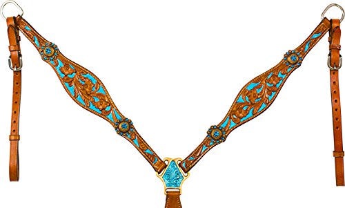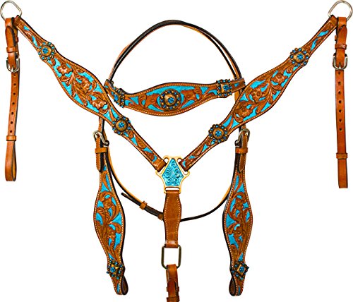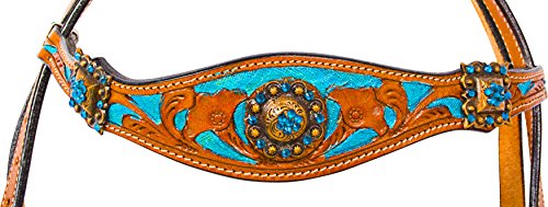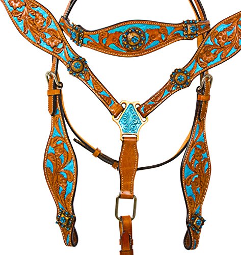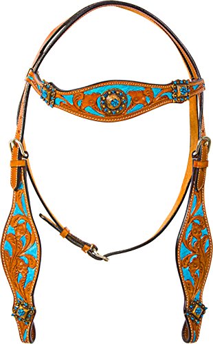 Studio : Acerugs Publisher : Acerugs Binding : Misc. Product Description *** Please note, each tack set is individually handmade and hand painted. It may have minor cosmetic imperfections within the painting. These imperfections do not affect the integrity, durability, or functionality of the tack set. Price has been reduced accordingly.?**** Really make your horse stand out in this beautiful turquoise inlay tack set! This set features decorative antique gold diamond and sun shaped conchos with turquoise crystals on the headstall and breast collar with a hand carved floral tooling on chestnut oil leather. The tooling is inlayed in a metallic turquoise that is carefully hand painted to really make this set stand out above the rest. This set features stainless steel hardware with Chicago screw bit and rein attachments. Tack Set Specifications: Color: Chestnut Oil Turquoise Crystal Conchos Hand Painted Turquoise Inlay Hand Carved Floral Tooling Stainless Steel Hardware Chicago Screws Tack Set Measurements: Brow Band: 16" Reins: 82" = 6.83 feet, split reins Bit to Bit: 41 - 45" with room for adjustments Throat Latch: 37 - 41" with room for adjustments Breast Collar: 55 - 62" with room for adjustments Girth Connector Strap: 18 - 22" with room for adjustments 0