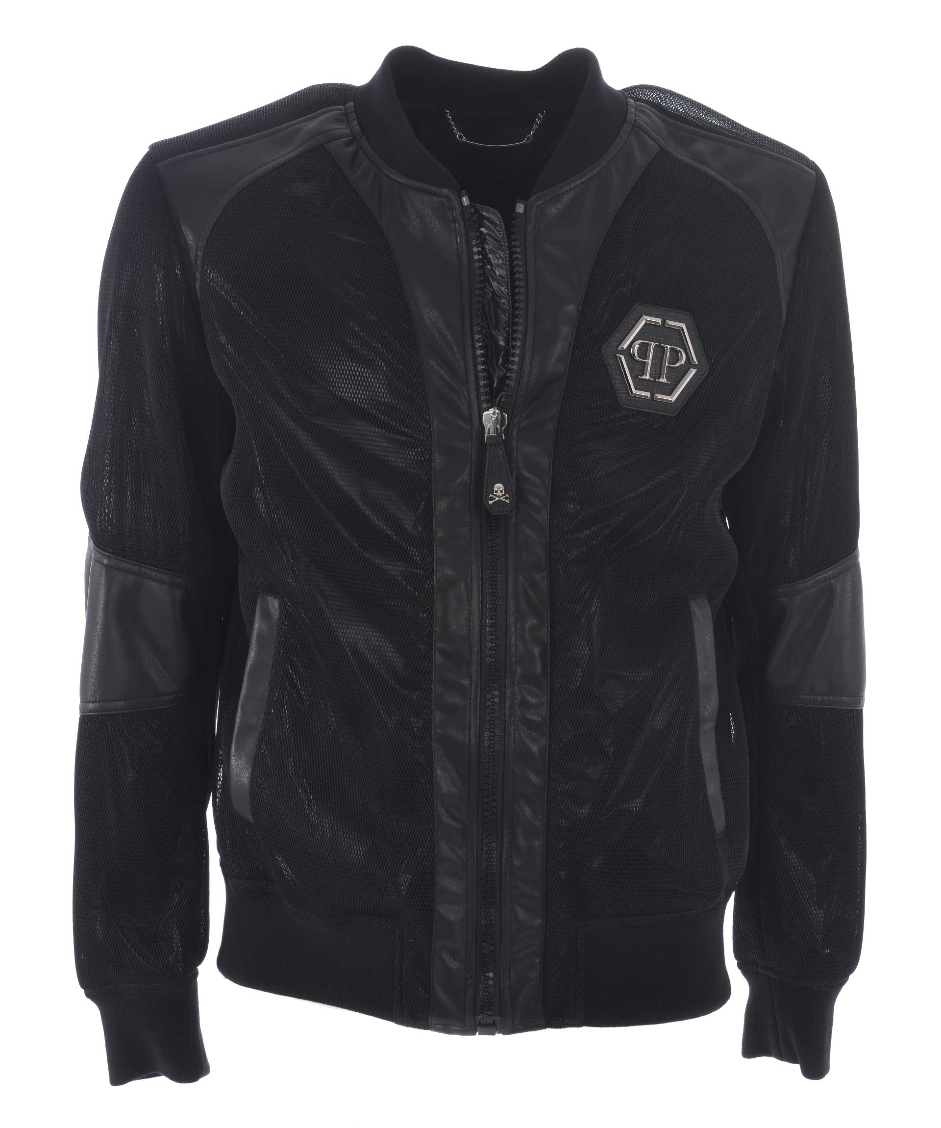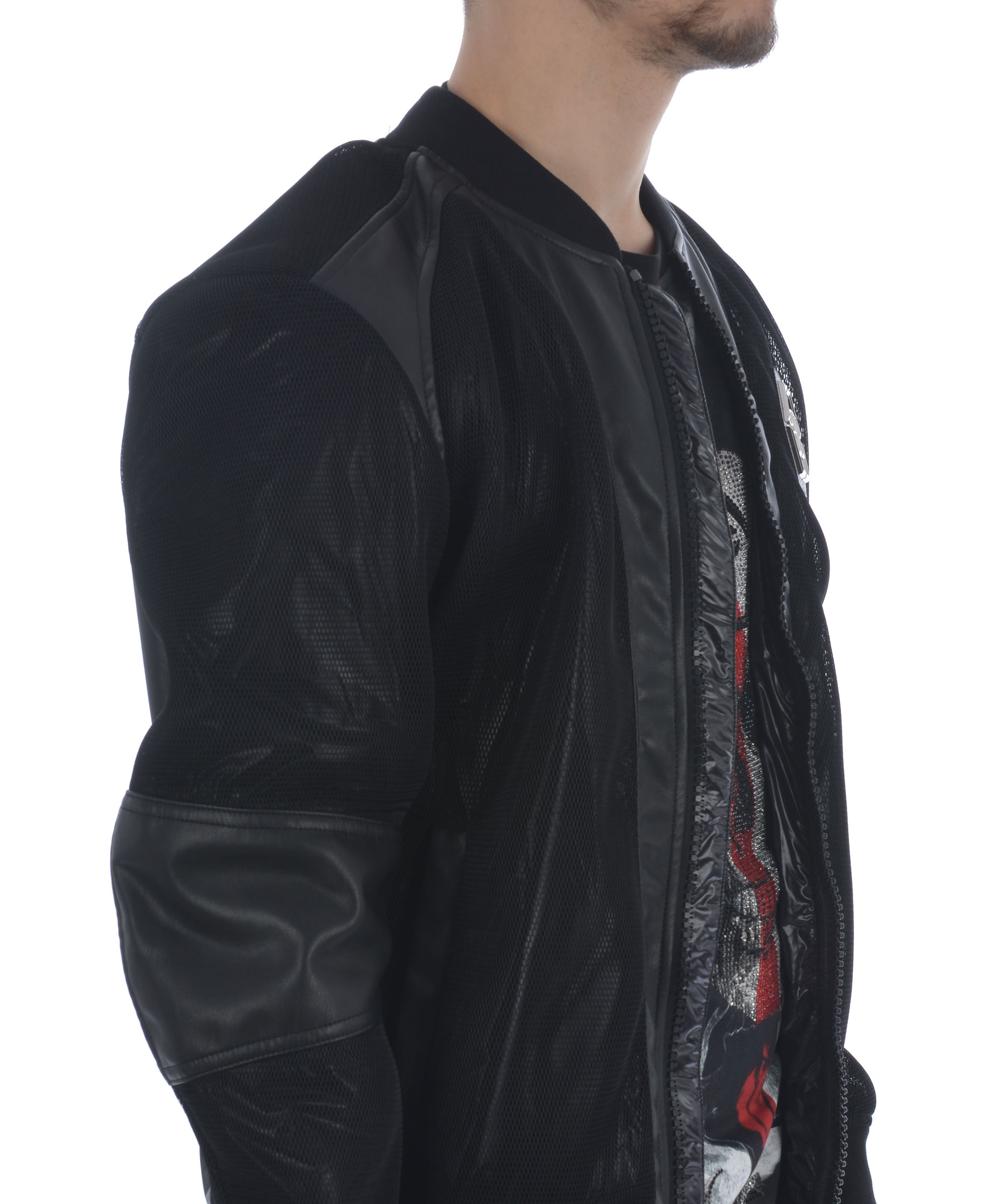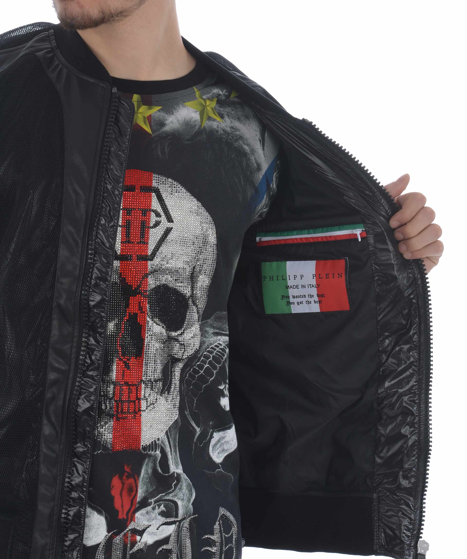 Giubbotto biker Philipp Plein in nylon lucido Nero e nylon a rete sovrapposto. Inserti in ecopelle. Pannello posteriore in ecopelle con teschio a rilievo. Colletto in maglia a costine. Tasche con zip. Tasca interna con zip. Chiusura con zip. Polsi e fondo in maglia a costine. Patch logo frontale. Foderato.