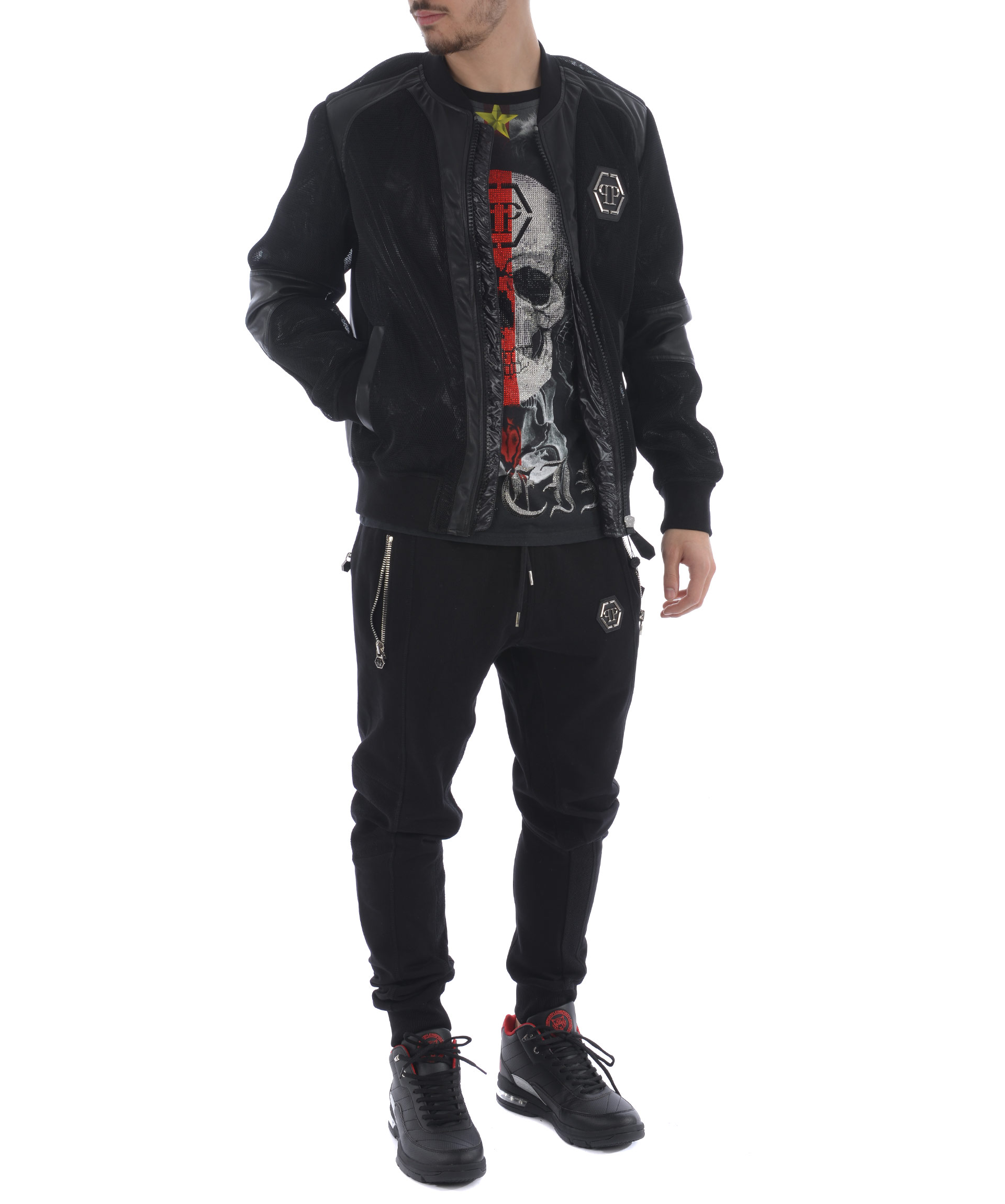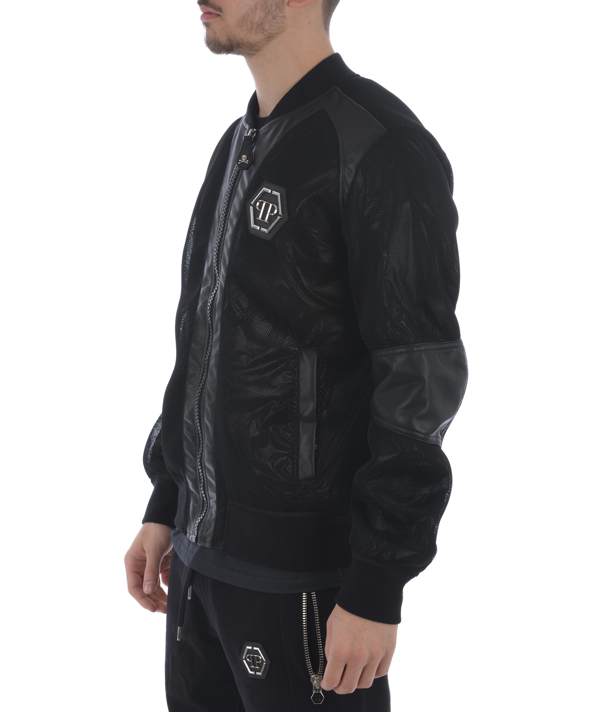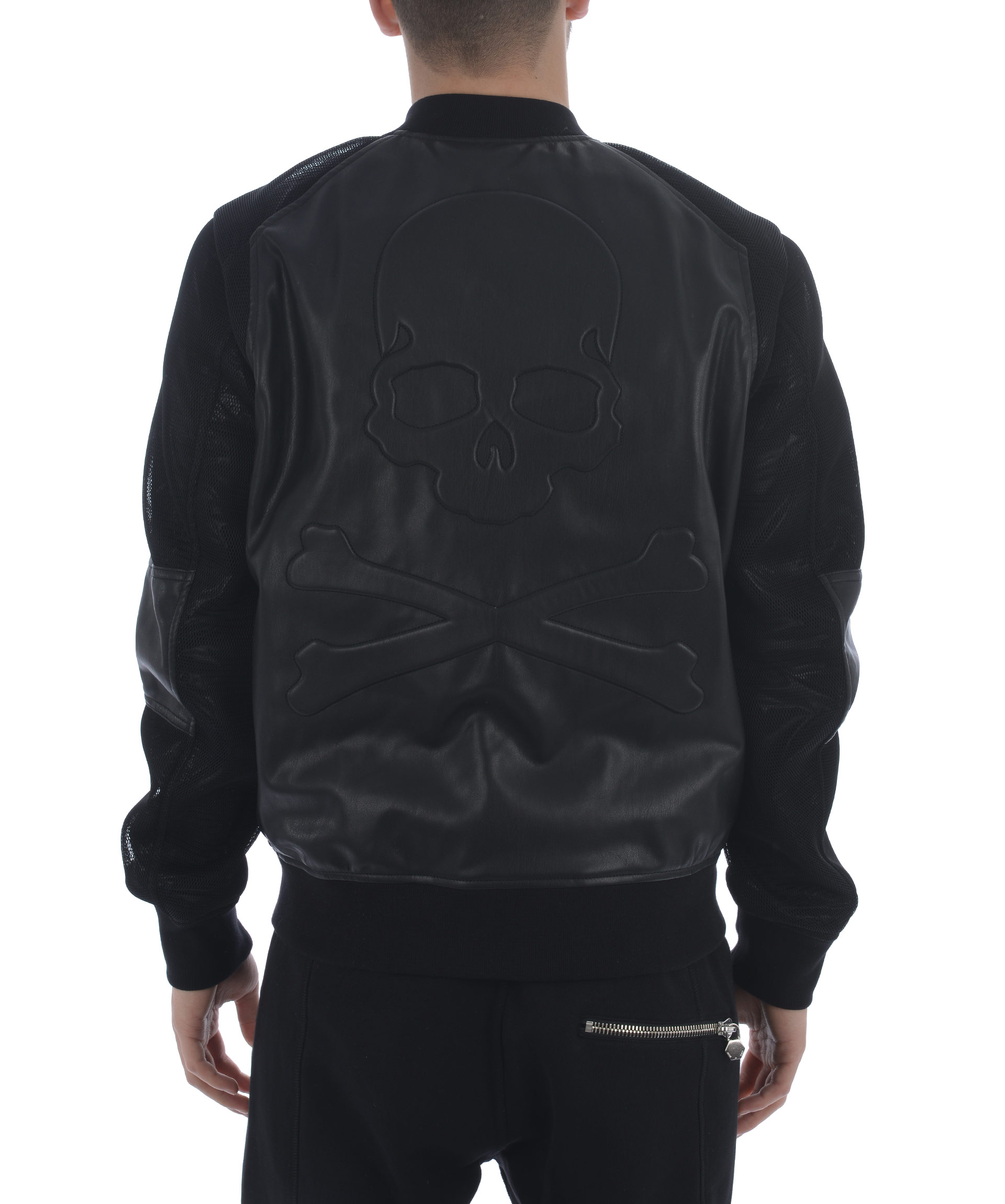 Giubbotto biker Philipp Plein in nylon lucido Nero e nylon a rete sovrapposto. Inserti in ecopelle. Pannello posteriore in ecopelle con teschio a rilievo. Colletto in maglia a costine. Tasche con zip. Tasca interna con zip. Chiusura con zip. Polsi e fondo in maglia a costine. Patch logo frontale. Foderato.