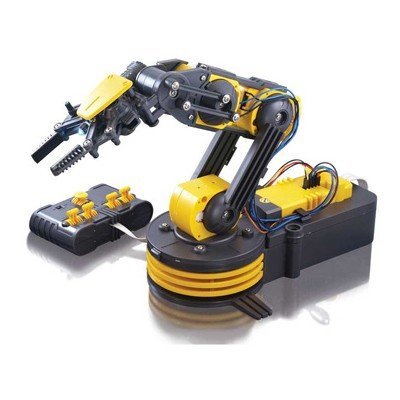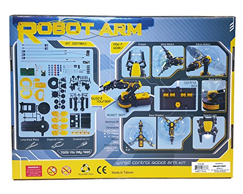 -. Feature : Learn basic robot technology by building your own controllable robot with an LED light, five motors and five joints / Command the Robotic Arm gripper using the wired controller to open, close, reach, rotate, grab, and release / Some of the added features include a search light design on the gripper and a safety gear audible indicator on all five gear boxes to prevent any potential injury or gear breakage during operation / Wrist range of motion: 120°. Elbow range of motion: 300°. Base rotation: 270°. / No soldering required