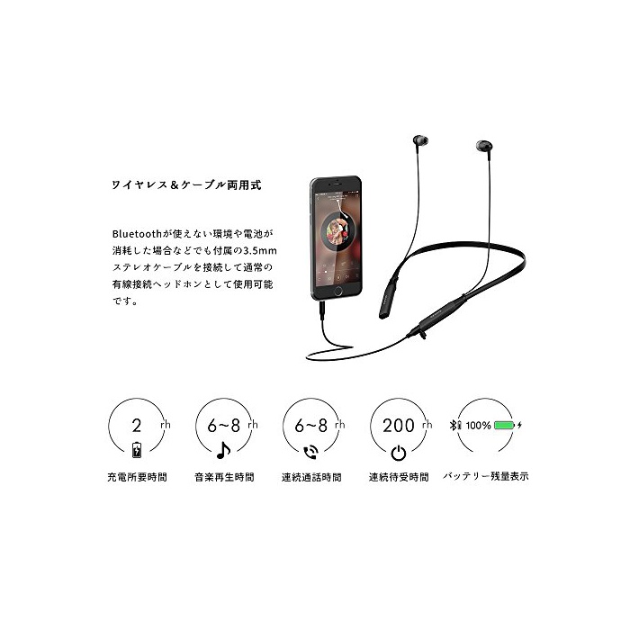 【 wireless&케이블 양용식 배터리 지속 】 Bluetooth를 사용할 수 없는 환경이나 전연못이 소모한 경우 등 그렇지만,부속 3.5mm스테레오 케이블을 접속해 통상의 유선 접속 헤드폰으로 해 사용 가능합니다.여유가 있는 배터리 내장,풀 충전 시간 약2시간,연속 통화 시간 약6~8시간,음악 재생 시간 약6~8시간,연속 수신대기 시간 약200시간입니다.접속 기기(iOS와 시판 대부분Android시스템의《스마호타부렛토》)나와 헤드 세트 본체의 밧데리잔 양표시 가능합니다.