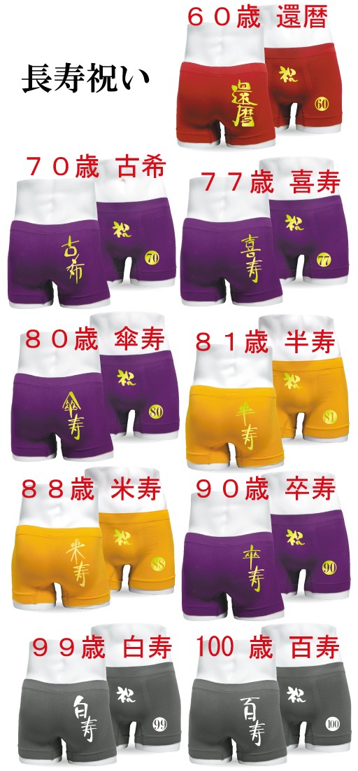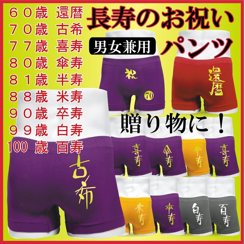 ちゃんちゃんこはもう古い! 長寿のお祝いに実用性抜群のインナーパンツを父・母・おじいちゃん・おばあちゃん、ご両親にプレゼントしませんか?長寿のお祝いごとにデザインされたボクサーパンツは伸縮性の高いナイロン素材を使用し男女共に着用できるんです。きっと笑顔になる素敵なプレゼントです。60歳 還暦 70歳 古希 77歳 喜寿 80歳 傘寿 81歳 半寿 88歳 米寿 90歳 卒寿 99歳 白寿 100歳 百寿 ご希望のお祝いパンツを選んでご購入くださいませ。