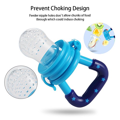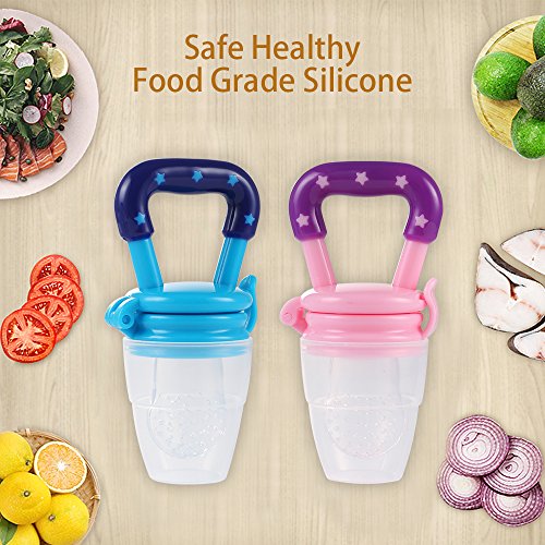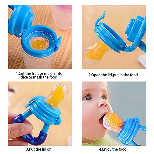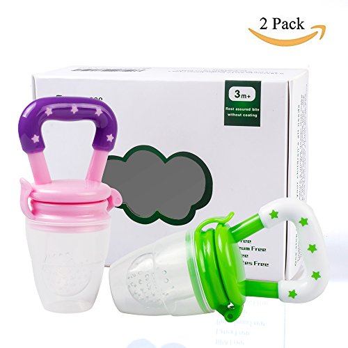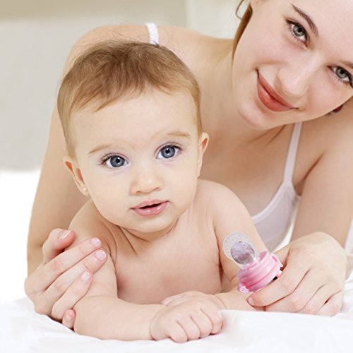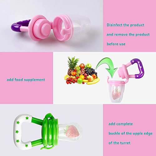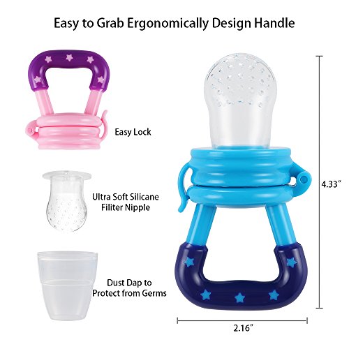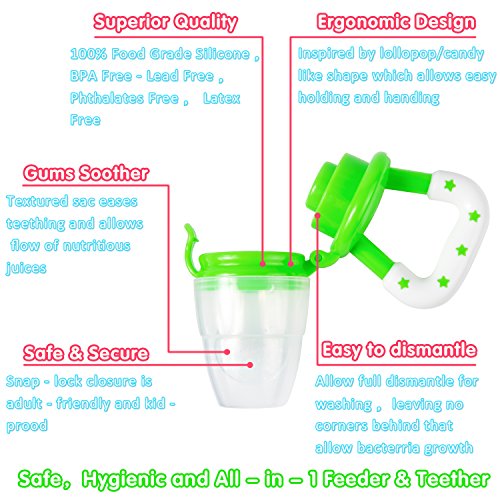 -. Feature : 2-in-1 FOOD FEEDER: Fresh Food/Fruit Feeder - Mesh Pouch Pacifier has 100% Food Grade Silicone Nipple - Baby Food Pacifier is Food Grade Silicone which is BPA Free, Lead Free, Petroleum Free, Latex Free and Phthalates Free / Baby Mesh Food Smasher/Feeder is a Teething Net Food Pacifier, it care about Infant Nibbler and Baby Teething as well plus it does not retain odors, and encourages chewing, more natural and comfortable to the baby. This award-winning baby feeder teether pacifier provides a safe and easy way for your child to enjoy fresh food and nutrients at an early age without the risk of choking / THE SILICONE FOOD FEEDER - baby reusable food sucker pouch is a food strainer pouch holder- makes it easy for kid feeding and fit children growing up / TEXTURED BABY TEETHER - Designed with textured silicone surface, this baby feeder works best with frozen fruit or ice cube to soothe teething pain and massage baby's gum for baby feeding purposes / EASY TO CLEAN - Clean-up is very easy unlike other products that use the mesh material, all you do is wash in warm soapy water or boil the feeder nipple for sterilization. The food grade silicone is stain resistant and won't spot or stain like similar mesh bag products
