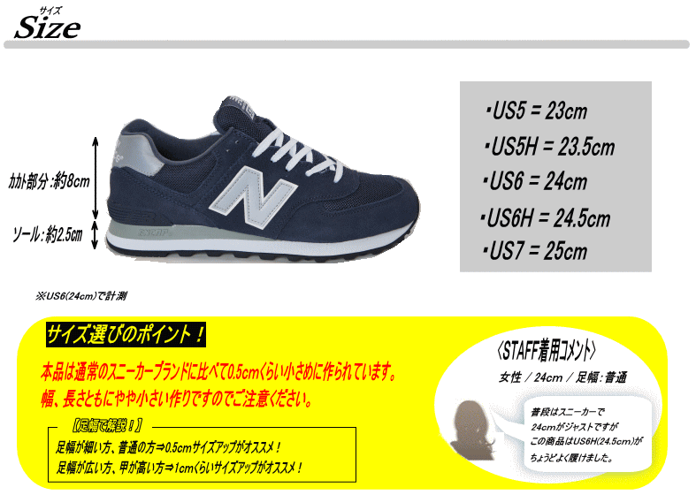 | サイズ | 作り⇒やや小さめ 【サイズ選びのポイント!】 足幅が細い方、普通の方⇒0.5cmくらいサイズアップがオススメ! 足幅が広い方、甲が高い方⇒1.0cmくらいサイズアップがオススメ! |