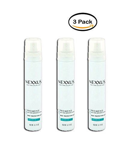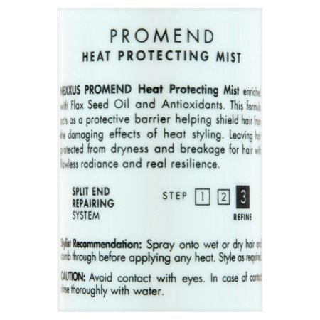 -. Binding : Misc. -. Brand : Nexxus -. EAN : 0658448750324 -. Feature : Nexxus PROMEND Heat Protecting Mist, enriched with Flax Seed Oil and antioxidants, acts as a protective barrier helping shield hair from the damaging effects of heat styling. Protects from dryness and breakage for hair with flawless radiance and real resilience / Nexxus Promend Heat Protecting Mist helps protect hair prone to split ends during heat styling / Enriched with Flax Seed Oil and antioxidants / Acts as a protective barrier, helping shield hair from the damaging effects of heat styling / Leaves hair protected from dryness and breakage -. IsAdultProduct : 0 -. Label : Nexxus -. LegalDisclaimer : Actual product packaging and materials may contain more and different information that what is shown on our website. we recommend that you do not rely solely on the information presented that you always read labels, warnings and direction before using and consuming a product. -. Manufacturer : Nexxus -. MPN : 41061 -. PartNumber : 41061 -. ProductGroup : Beauty -. ProductTypeName : BEAUTY -. Publisher : Nexxus -. Size : 5.1 Ounces -. Studio : Nexxus -. Title : PACK OF 3 - Nexxus Promend for Split Ends Heat Protecting Mist 5.1 oz -. UPC : 658448750324