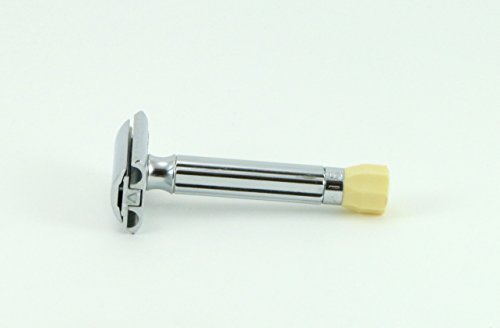 Merkur Progress Adjustable Safety Razor (500) This razor has a 3 1/2" handle and a classic design and polished chrome finish give the Progress double edge safety razor by Merkur a clean, timeless look. The Progress is adjustable making it simple to customize your shave. With a twist of the knob at the end of the handle, you can raise or lower the pitch of the blade to suit your beard and skin type. Includes a variety of 15 blades randomly selected from our most popular brands!