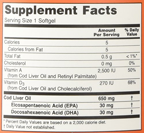 Cod Liver Oil is a fish oil supplement rich in certain nutrients such as Vitamins A and D-3. It also contains Omega-3 Fatty Acids, specifically EPA (Eicosapentaenoic Acid) and DHA (Docosahexaenoic Acid), which have been shown to support overall health. This double strength Cod Liver Oil contains twice the Vitamin A and D-3 as in our regular strength Cod Liver Oil softgels. From the FDA's website: