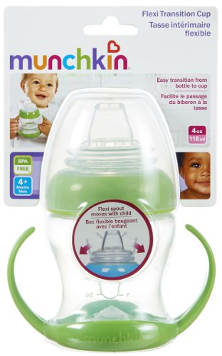 -. Binding : Baby Product -. Brand : Munchkin -. Color : Green -. Feature : Flexible, soft spout moves with your baby and is gentle on sensitive gums / Removable handles are easy for small hands to hold / Lid covers spout while out and about / BPA-free, top rack dishwasher-safe / 4+ months -. Label : Munchkin -. Manufacturer : Munchkin -. ProductGroup : Baby Product -. ProductTypeName : BABY_PRODUCT -. Publisher : Munchkin -. Studio : Munchkin -. Title : Munchkin Flexi Transition Cup, Green, 4 Ounce